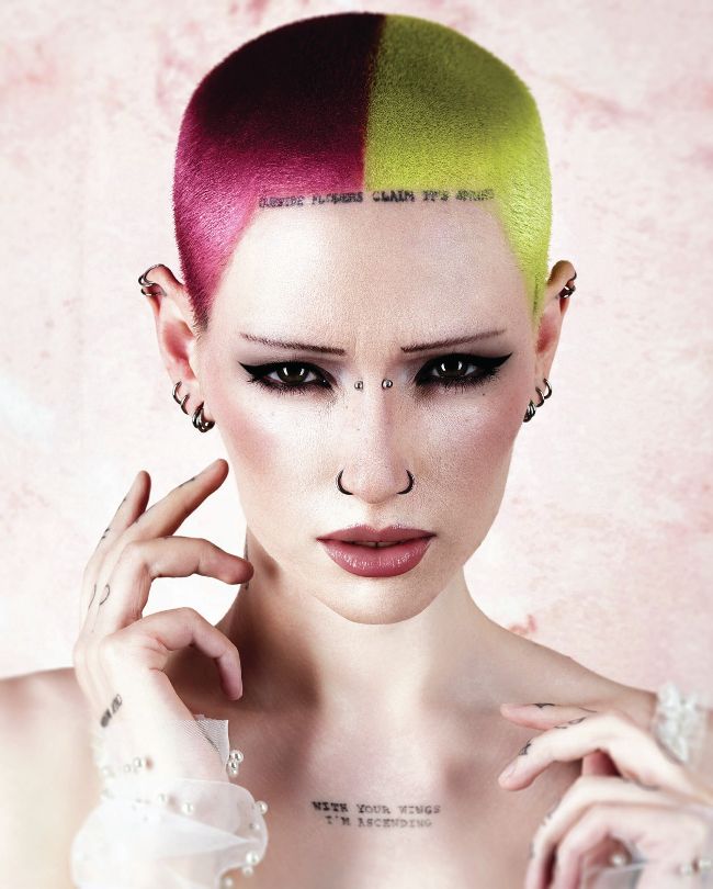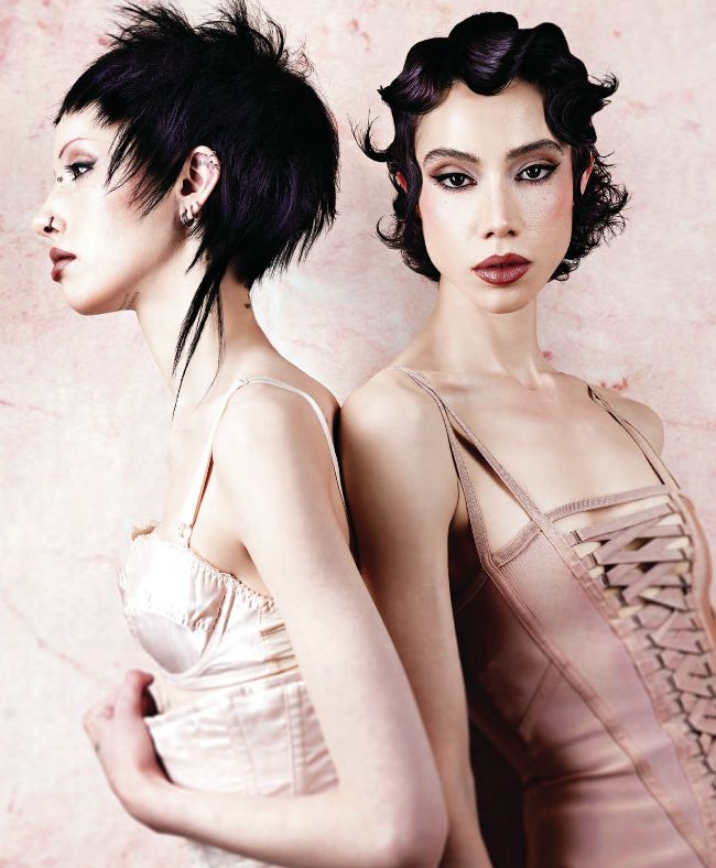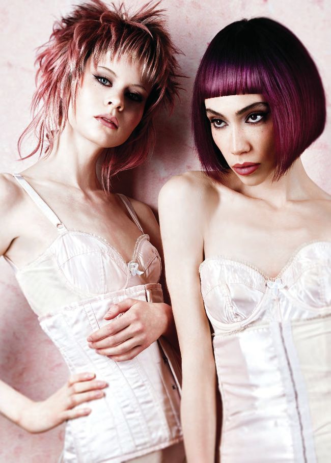 “Boudoir is a collection that draws inspiration from the delicate elegance of lingerie and the dreamy softness of pastel tones. The hair contrasts strikingly against this gentle backdrop, showcasing sharp textures, bold silhouettes, and daring colour placements. Each look merges sensuality with edge, balancing femininity, and strength to create a modern take on intimacy and self-expression.”