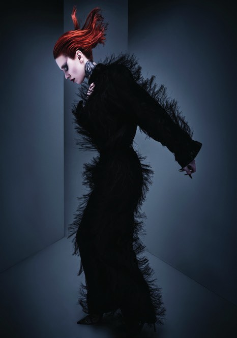 I generally take an image that isn’t hair related and use the emotion it portrays to create looks. I wanted the hair to feel extreme but also beautiful. I always try and find ways to push a look one step further, and the hair was a reflection of me doing that. I don’t consider myself a ‘cutter’, so I wanted to include haircuts that challenged me.