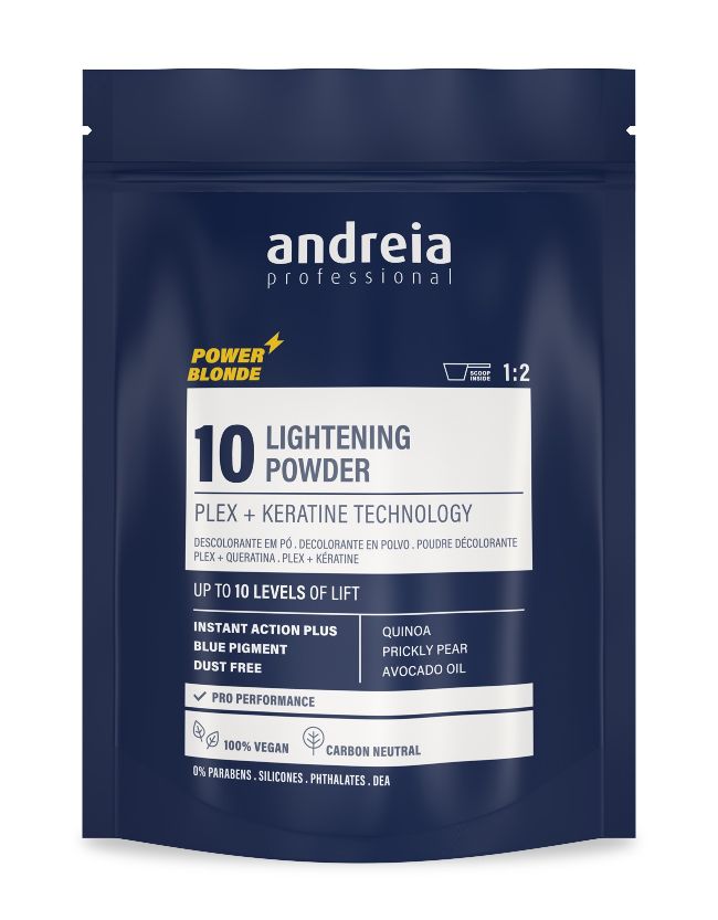 Andreia Professional Lightening Powder 10 Power Blonde offers up to 10 levels of lift while prioritising hair fibre integrity and ultimate colour results.