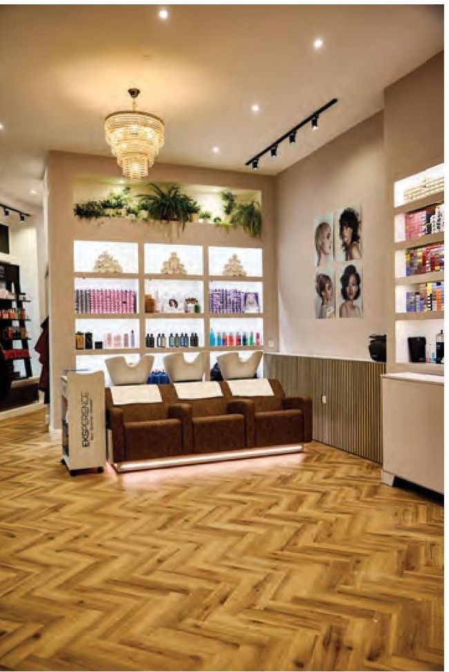 The building’s Art Deco heritage heavily influenced the final design. Polished pebble walls, rose-gold accents, parquet oak flooring and soft neutral tones create an elegant yet modern aesthetic. Lighting plays a central role, with over 100 LED spotlights designed to mimic natural daylight, ambient backlighting and three statement chandeliers. The salon also features three backwashes, a dedicated toning area with adjustable lighting and two bespoke murals inspired by Teresa’s 2024 British Hairdressing Awards, sponsored by Schwarzkopf Professional, finalist collection for Southern Hairdresser of the Year.