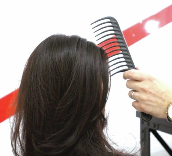 Finally, use the teeth of the Denman D28 Wide Tooth Detangler comb to loosely direct the hair into a soft finish and spray with a soft-hold dry hairspray. The result is full-bodied, soft and elegant.
