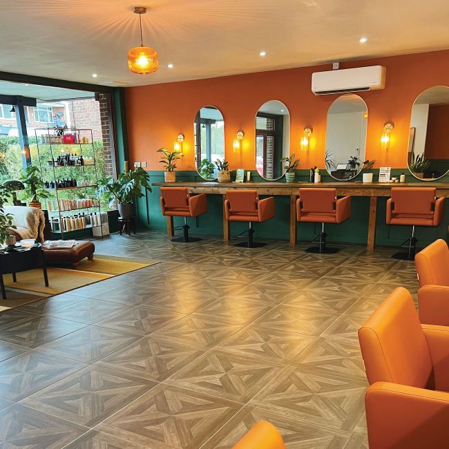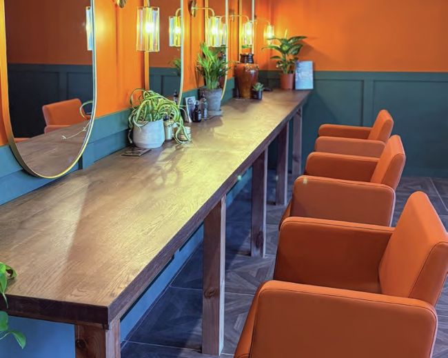 The salon features eight styling chairs, sourced from Ayala and upholstered in orange to complement the wider palette. Rather than each chair having its own section, two long work benches run the length of the walls, creating an uninterrupted sense of openness. Explaining this decision, Harry notes: “Many of our clients work remotely, so the continuous bench gives them room for laptops, coffee and personal items without feeling cramped.”
