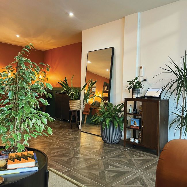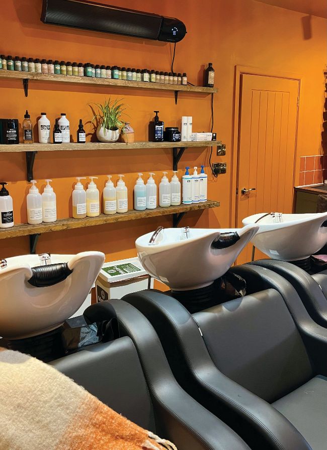 Harry was initially drawn to the space for its potential. A large window running the length of the building, flooded the interior with natural light while the white walls offered a blank canvas. He chose a bold palette of luxe raw sienna and forest green – a combination he describes as both grounding and vibrant. “The green adds depth and calm, anchoring the space, while the orange brings warmth, energy and personality.” Colour was used intentionally to shape the client experience, particularly in the basin room. “It’s completely colour-drenched in burnt orange,” he explains. “It feels cocooning, like being hugged by the space, encouraging clients to slow down and relax, amplifying that sense of comfort and escape.”